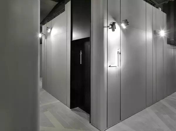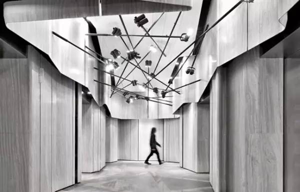 天花上縱橫交錯(cuò)的特製黑色LED射燈,由八種不同長(zhǎng)度的射燈組合而成,長(zhǎng)度由一米至六米不等,每支射燈的方向跟角度也不一