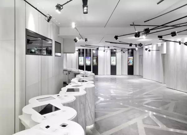 當(dāng)移步到購(gòu)票大堂,修長(zhǎng)而順滑地彎曲的柜臺(tái)瞬時(shí)令來(lái)賓止住了腳步,那種彎曲的弧度跟墻上的「交卷」竟然有種莫名的一致性,設(shè)計(jì)延伸