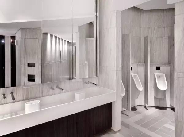 衛(wèi)生間用綠色的長(zhǎng)方形作為隔間,門四周圍繞著發(fā)冷光的燈