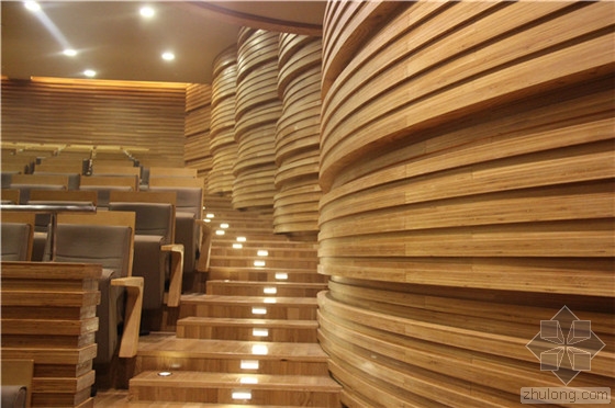其中,劇院入口處是一個巨大的正圓筒,直徑30.6米,高33.9米,從視覺上看,完全是原木木條包裹著墻體。從斜筒自然延伸而出,就是水景舞臺,而通過順著“斜筒”角度鋪設(shè)的臺階,可以觀看水景舞臺的精彩表演。"